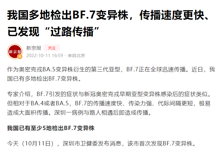 奥密克戎BF.7变异株,相对于BA.4或者BA.5,BF.7的传播速度快、传染力强、代际间隔更短,极易造成大面积传播。世界卫生组织发出警示,BF.7正在全球传播,“几周内或成主流”。10月11日时,深圳一病例与路边行人相遇时,两人均未戴口罩,造成病毒传播。