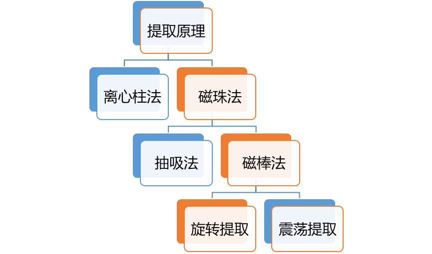 以磁珠为载体,利用磁珠在高盐低PH值下吸附核酸,在低盐高PH值下与核酸分离的原理,再通过移动磁珠或转移液体来实现核酸的整个提取纯化过程。由于其原理的独特性,所以可设计成很多种通量,既可以单管提取,也可以提取8-96个样本,且其操作简单快捷,一批次上机提取时间为9~40min(不同样本不同厂家时间不同),大大提高了实验效率,且成本低廉,因而可以在不同实验室使用,是目前市场上的主流仪器。
