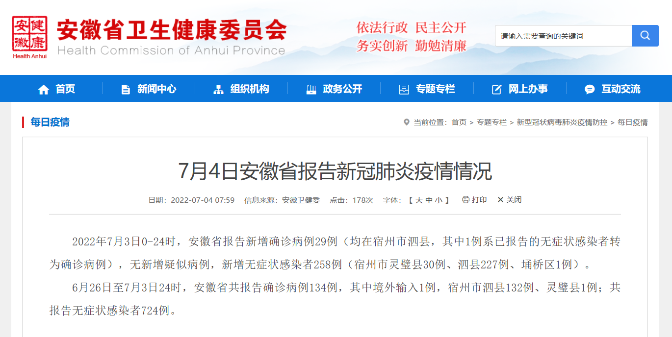 据安徽卫健委通报,2022年7月3日0—24时,安徽省泗县报告新增本土确诊病例29例,无新增疑似病例,新增本土无症状感染者227例。本轮疫情,全县累计感染754人。