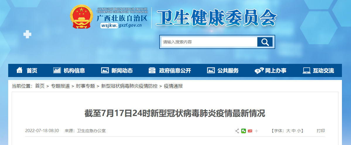 7月17日0-24时,广西新增本土确诊病例59例(均在北海市,其中海城区41例、银海区12例、合浦县5例、铁山港区1例),含31例无症状感染者转为确诊病例(均在北海市),无症状感染者53例(北海市51例,其中海城区28例、银海区13例、合浦县8例、铁山港区2例;南宁市宾阳县1例;钦州…