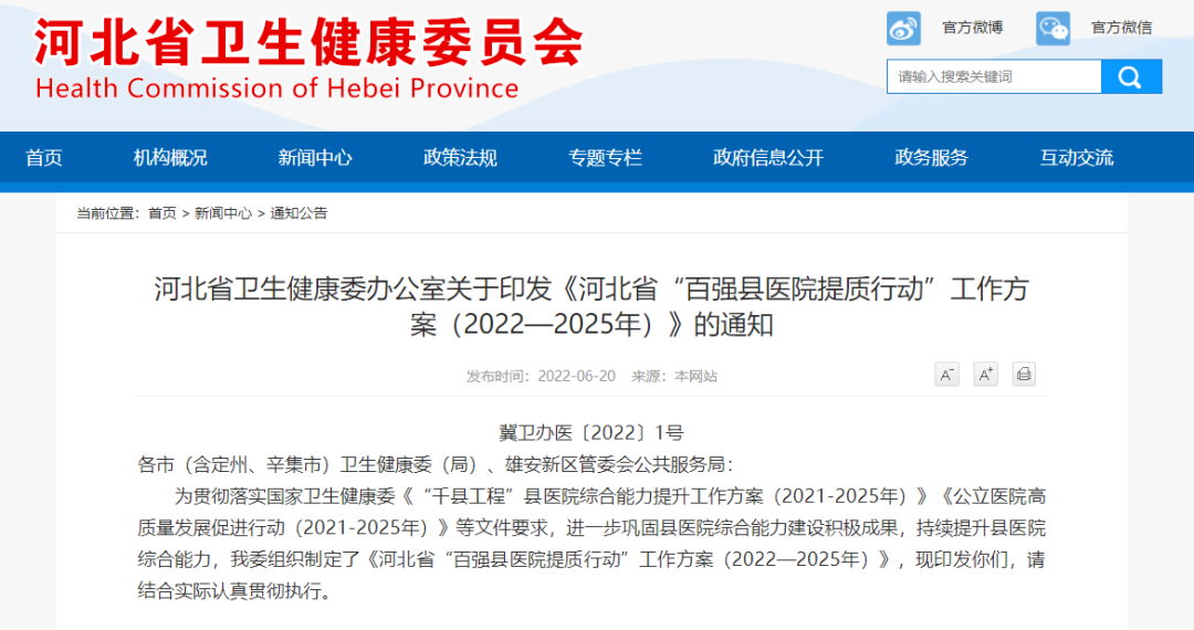 近日,为贯彻落实国家卫生健康委《“千县工程”县医院综合能力提升工作方案(2021-2025年)》《公立医院高质量发展促进行动(2021-2025年)》等文件要求,进一步巩固县医院综合能力建设积极成果,持续提升县医院综合能力,河北省卫生健康委组织制定了《河北省“百强县医院提质…