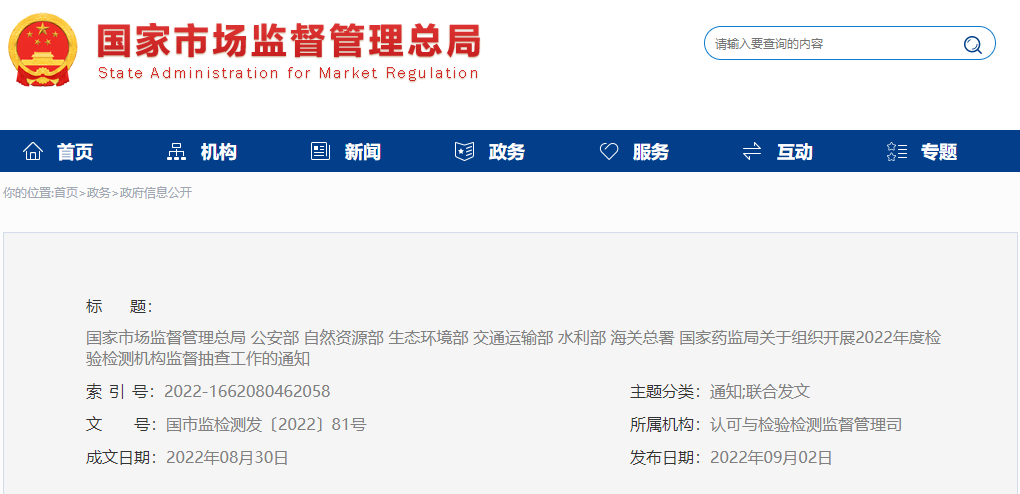 9月2日,国家市场监督管理总局等八部门联合发文《关于组织开展2022年度检验检测机构监管抽查工作的通知》(下称《通知》),指出定于2022年9月至10月在全国范围内开展检验检测机构“双随机、一公开”监督抽查。《通知》明确,将开展国家级资质认定检验检测机构监督抽查,从国家…
