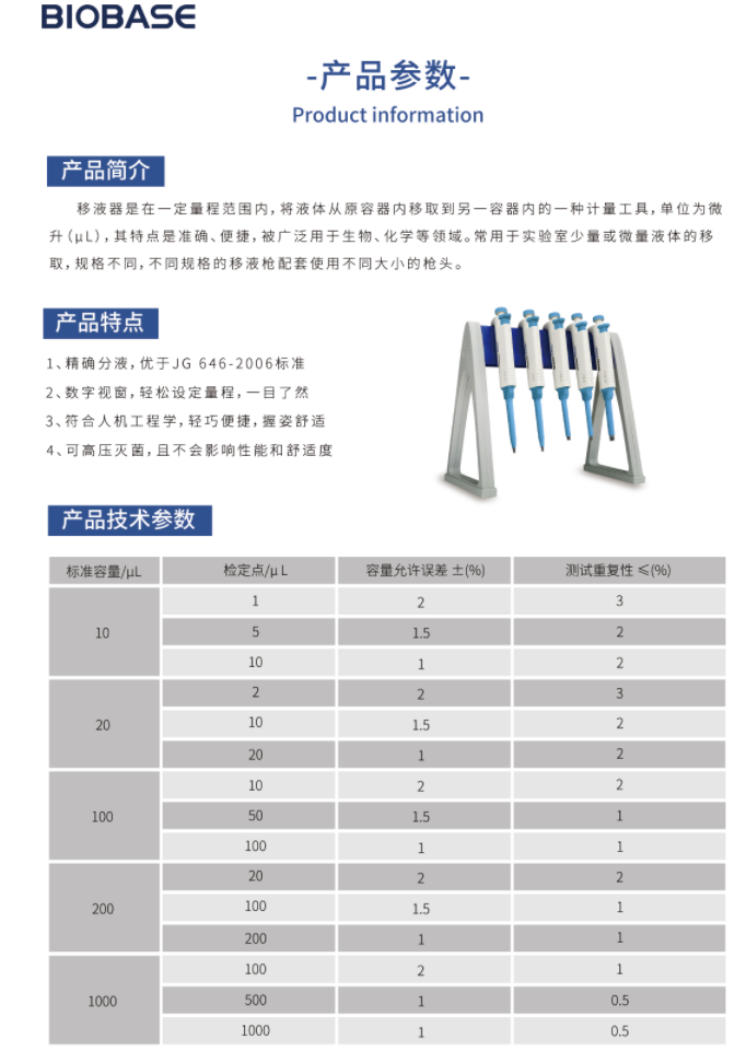 当前位置 > 首页 > 产品中心  > 样品前处理 > 移液器> 博科/BIOBASE整支消毒单道可调移液器20-200μl_可调式移液器